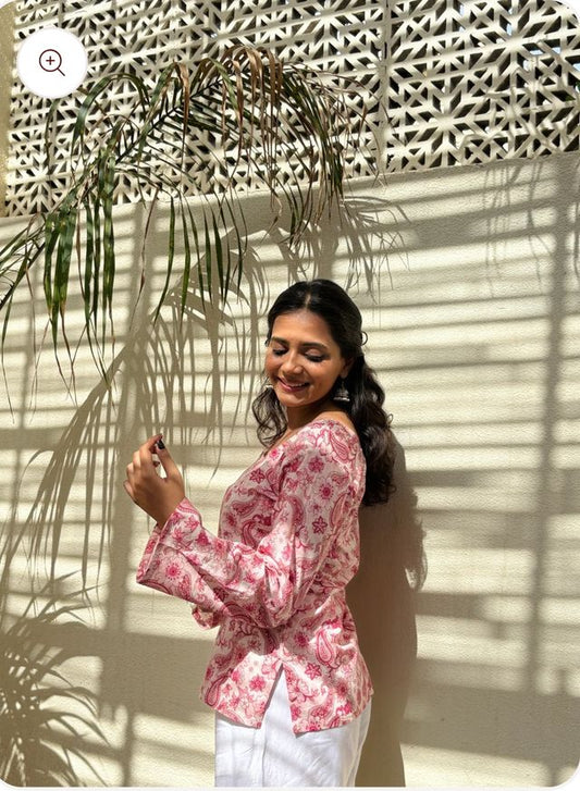 Women's Printed Straight Sleeveless Square Neck Flared Short Kurti for Women & Girls – Pink & White Designer Kurti